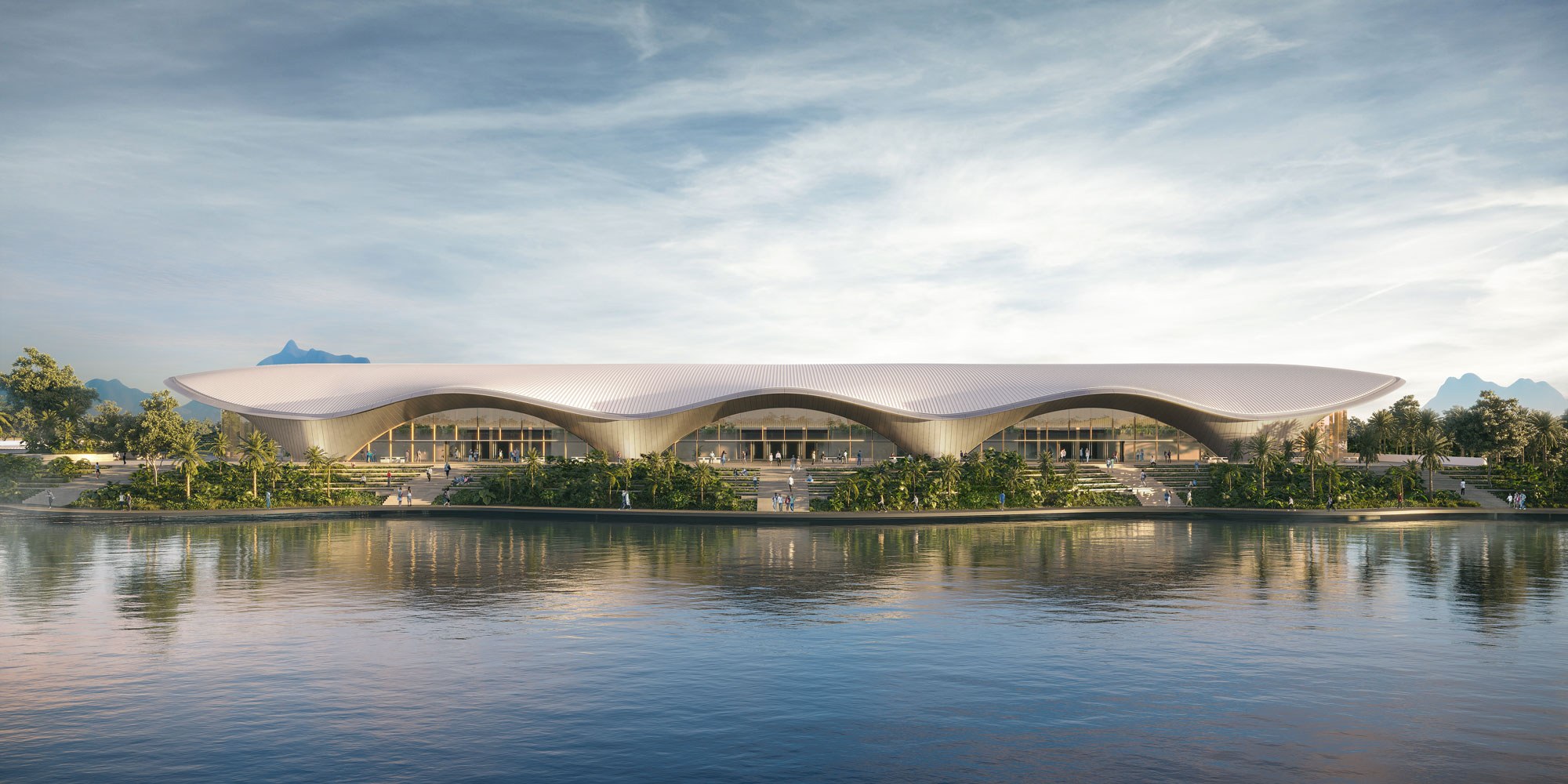 Set on a sprawling waterfront site adjacent to the existing Convention Centre and overlooking the Sarawak River, BCCK 2's curvilinear form resembles the seed of a Belian tree — a protected hardwood species native to the area and used in traditional structures, such as the iconic Dayak Longhouses.