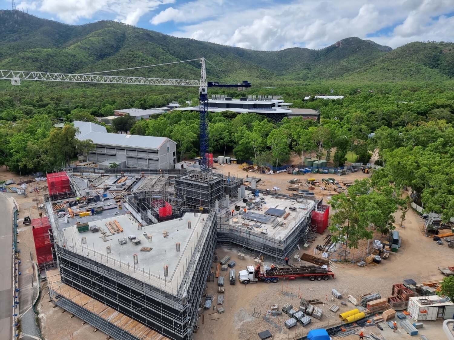 A construction milestone has been achieved for the JCU Technology and Innovation Complex (TIC) with the completion of the 14m x 6m Destructive Testing Strong Floor. This world class engineering & research facility provides simultaneous load capacities of 1000kN to perform precision destructive testing of structural elements. The 800mm deep structure is supported by a dense column grid and requires precise uniformity for the assembly of testing equipment. A complex construction challenge met by Besix Watpac.
