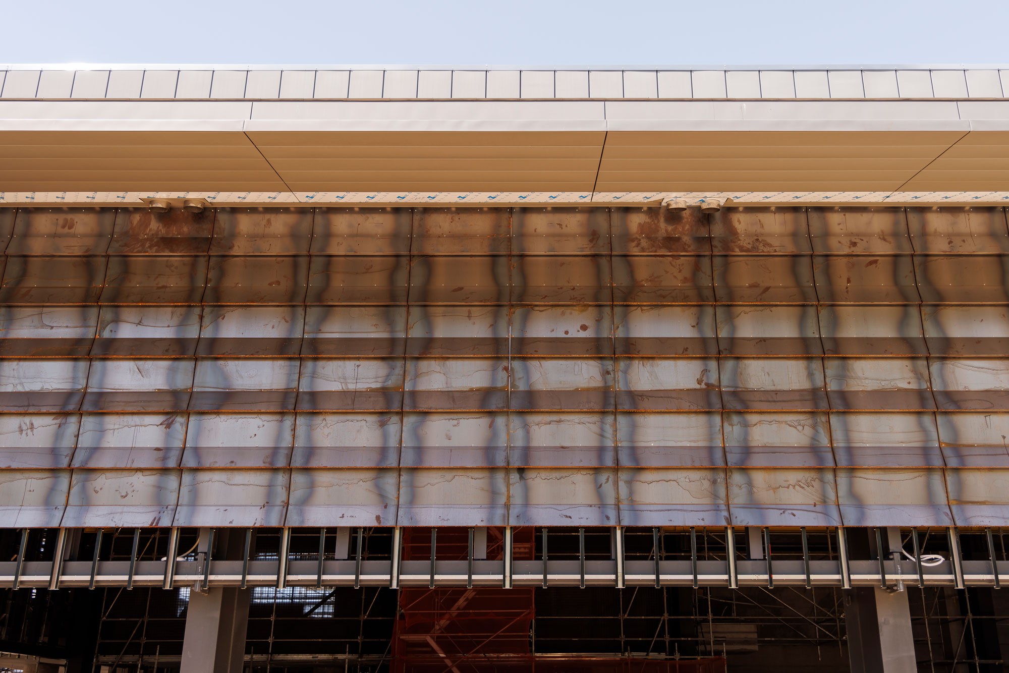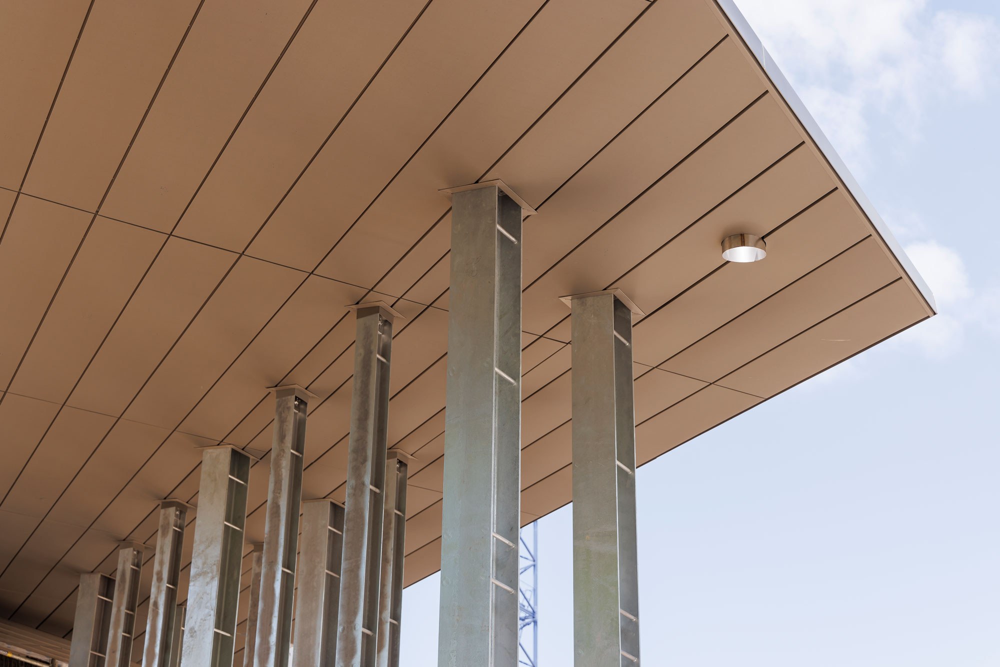 Unlike typical soffit panels, bought en masse and rapidly installed, each panel of TIC's soffit is custom-made and folded to suit TIC's defining parasol design.