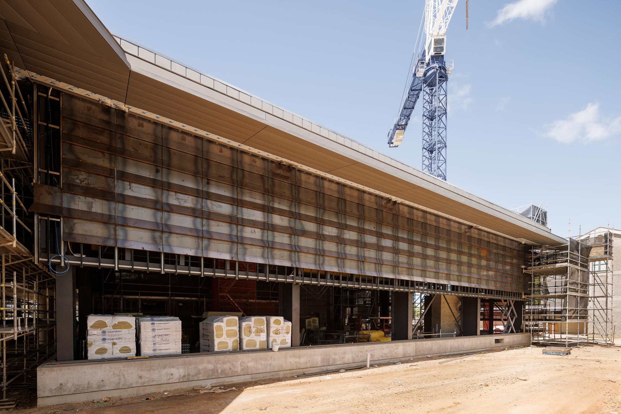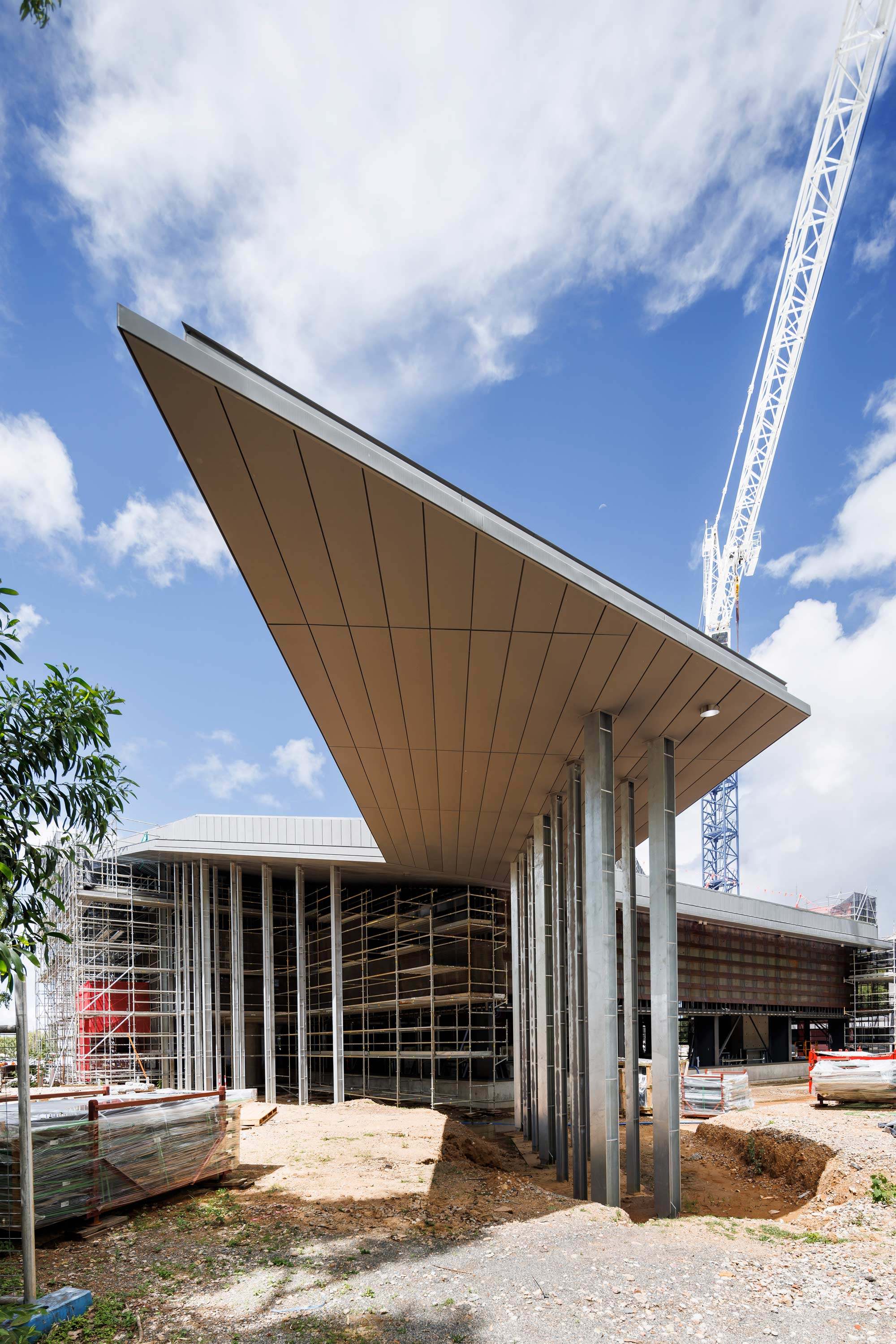 A key project milestone has been the installation of the expansive high-performance protective roof. The folded parasol design is a distinctive architectural feature of the building.