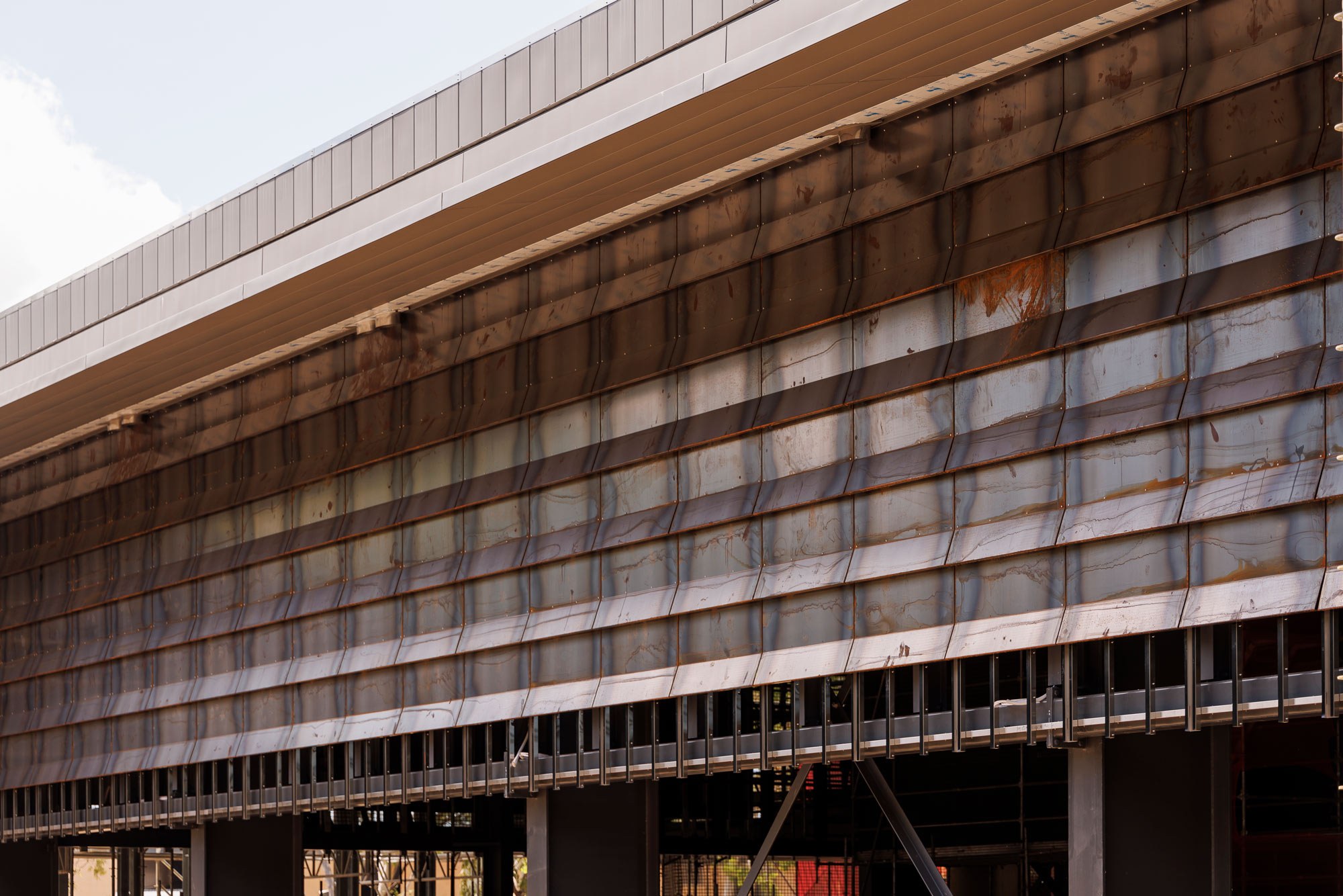 TIC's Structures Lab is wrapped in a bespoke weathering steel louvre system, allowing permanent ventilation to the double-height space.