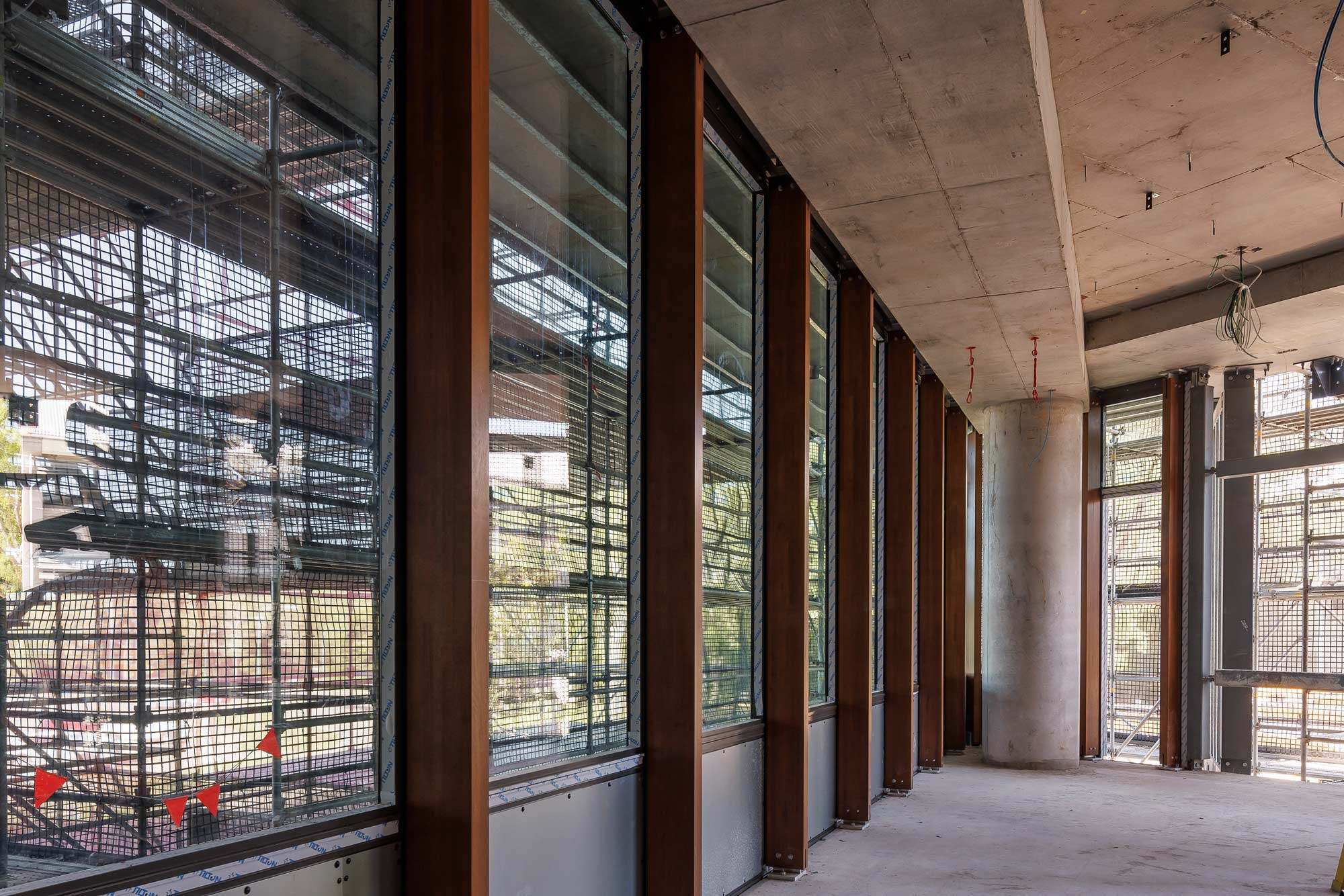 Our hybrid timber glulam (GLT) facade system with debris impact resistant glass is starting to emerge from beneath the scaffolding.