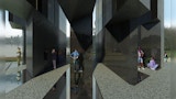 While formally abstract and demure the Centre makes provocative use of materials, which highlight it as a future landmark in the community. The building is fringed by sculptural blades of weathering steel, a material that responds to the corroded car bodies once found on site. These blades form a rippled screen to the street which reveals glimpses through the building when approached by vehicle.